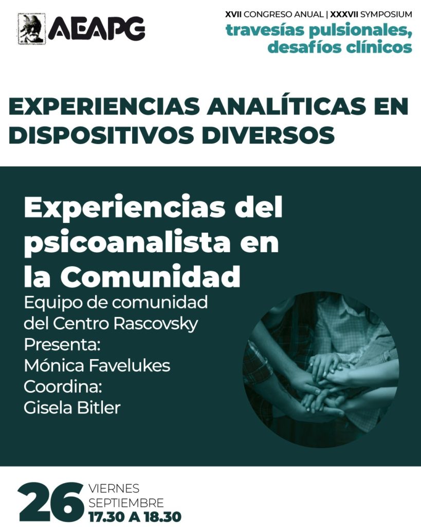 - EXPERIENCIAS DEL PSICOANALISTA EN LA COMUNIDAD – Equipo de comunidad del Centro Rascovsky Presenta: Dra. Mónica Favelukes – Coordina: Gisela Bitler