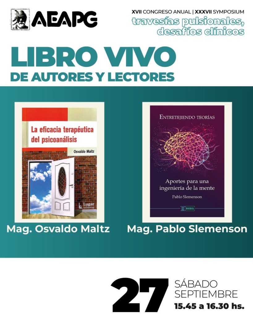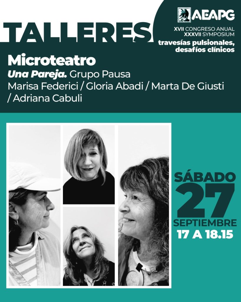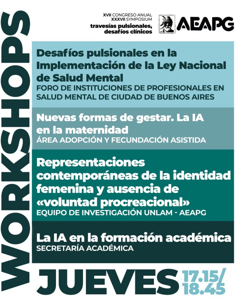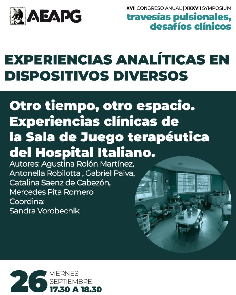 - OTRO TIEMPO, OTRO ESPACIO. EXPERIENCIAS CLÍNICAS DE LA SALA DE JUEGO TERAPÉUTICA DEL HOSPITAL ITALIANO – Agustina Rolón Martínez, Antonella Robilotta , Gabriel Paiva, Catalina Sáenz de Cabezón, Mercedes Pita Romero – Coordina: Mag. Sandra Vorobechik